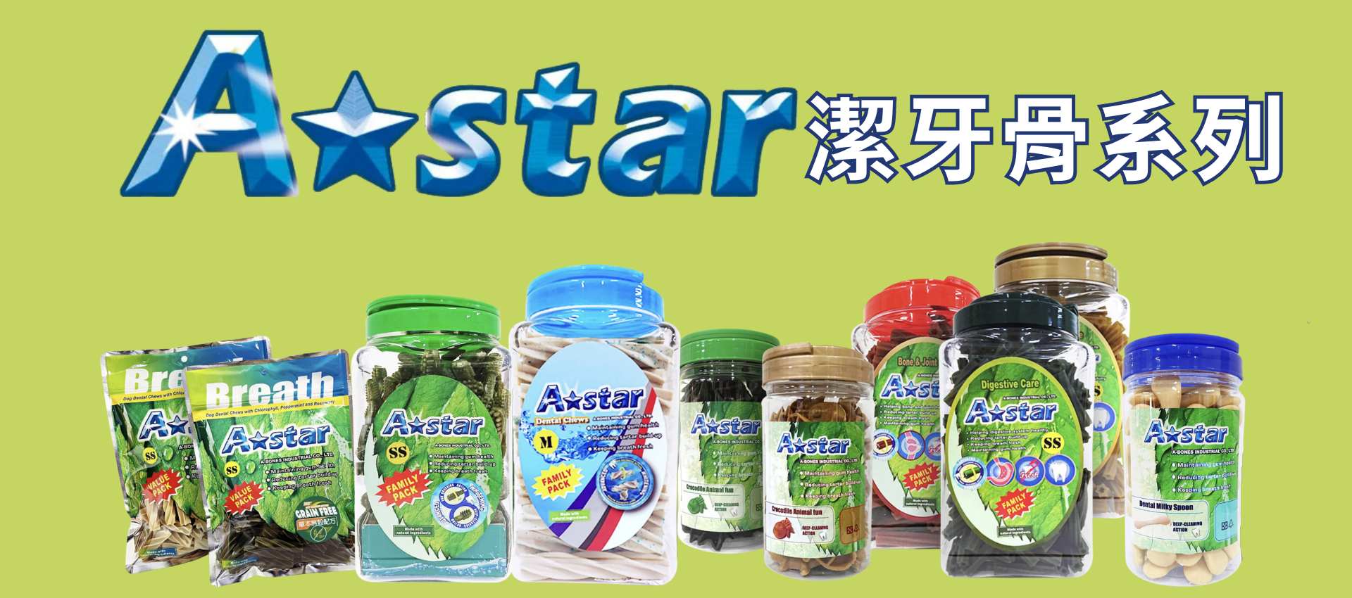 寵物的口腔牙齒健康很重要,因為是影響寵物攝取營養是否完全的關鍵,針對不同寵物牙齒的構造,開發了獨特專利造型的潔牙骨,可以確實幫助毛孩子的牙齒骨骼正常發育,並且達到磨牙的功效經過長年以來累積的信賴,才讓Astar成為現在寵物潔牙骨No.1的領導品牌。