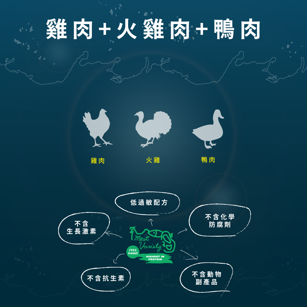 80%優質肉類蛋白(雞肉、火雞肉、鴨肉)