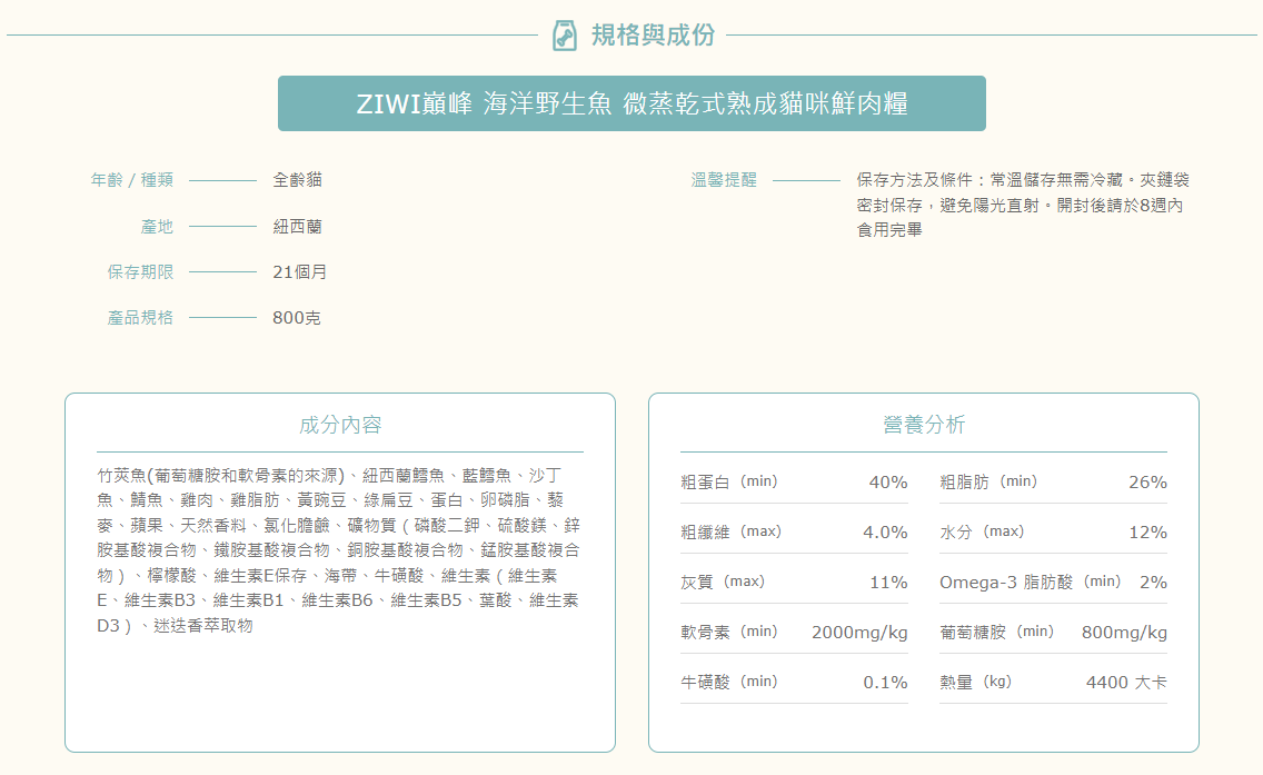 缺貨中/可等進口開放再下單(目前不知船期)-紐西蘭ZiwiPeak 巔峰 微蒸熟成鮮肉貓糧 - 海洋野生魚 800G (9421038210055)